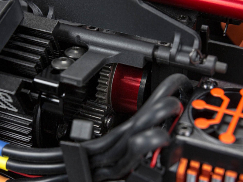 - Motor: Spektrum Firma 4074 2050Kv brushless motor – mounted on sliding plate with heatsink and cooling fan