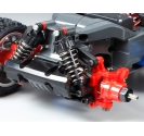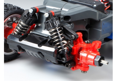 The Tamiya rally block tyre RC kit with 4-wheel double wishbone suspension is equipped with a suspension system that enhances both comfort and control. Each wheel benefits from independent double wishbone geometry, allowing for responsive movement and consistent ground contact. Friction dampers provide smooth damping, reducing bounce and improving stability. The drivetrain features a rear-mounted motor and shaft-driven 4WD layout, with differential gears in both front and rear gearboxes to ensure balanced power distribution and traction.