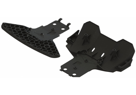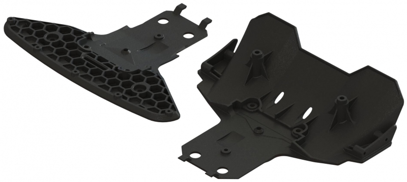 The ARRMA Lower Front Bumper and Rear Diffuser Set ARA320585 is a robust replacement kit made of tough composite material. It delivers reinforced protection to both the front and rear lower chassis areas during extreme bashing sessions.