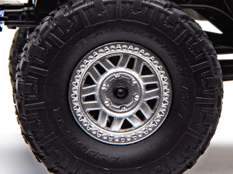 The SCX24 Jeep Gladiator mini crawler with Nitto tires and KMC Machete wheels features officially licensed Nitto Trail Grappler M/T tires mounted on KMC XD229 Machete wheels. These components deliver a blend of off-road grip and on-road composure, making the crawler versatile across multiple surfaces. The tyres are molded for aggressive traction, while the wheels feature a satin silver finish and intricate detailing that enhances scale realism. This combination ensures that the crawler not only performs well but also looks the part in any setting.