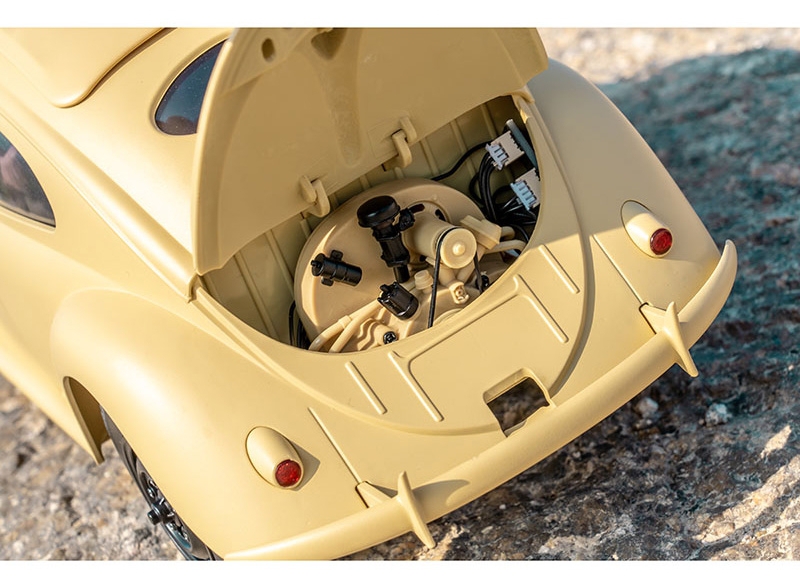 The ROC Hobby Type82E Beetle Kommandeurwagen ROC11242 scale RC car is based on the officer’s vehicle used by the North African Corps under General Erwin Rommel. Its design replicates the KdF-Wagen body mounted on the Type82 barrel car chassis, a rear-mounted, rear-drive configuration with limited-slip differential. The model’s air-cooled Boxer engine is a faithful reproduction, complete with belt-driven cooling fan and semi-circular fairing that distributes airflow to both cylinders. This attention to detail ensures that every mechanical element mirrors the original vehicle’s engineering.