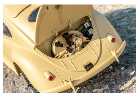 With regards to tires, the model adopts the same 5.25 x 16 off-road tires as the barrel car. The simulated wheels need to be fixed with 5 screws like the real car, and the spare tire in the front is readily accessible after opening the hood. Here you can also charge the battery at your convenience with battery properly stored in the actual car fuel tank.