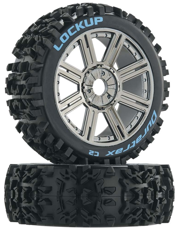 Deep knobby tread for high degree of traction Foam inserts ''Lockup'' and ''Duratrax C2'' printed on sidewall in blue Eight spoke wheels with 17mm hex