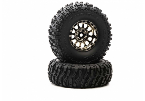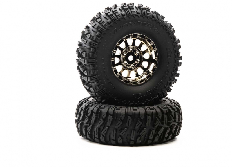 These Duratrax® ASCEND front and rear tires are Class 1 (4.19" outer diameter) size for maximum scale appearance, with a 1.9" inner tire/outer wheel diameter. Made from super-soft C3 compound rubber with an aggressive tread that bites into loose or muddy surfaces, these tires provide exceptional gripping power for climbing over slippery rocks and getting past the toughest obstacles. They include foam inserts and arrive factory-mounted to 12mm hex wheels that are molded from a durable black chrome composite plastic. Sold in pairs.