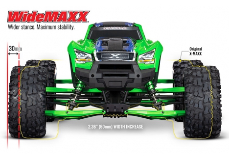 The Traxxas X-Maxx is a new breed of monster truck with a tough-as-nails attitude, brutal power, and unrivalled durability. The WideMaxx kit builds on the X-Maxx s already legendary performance by widening the stance 60 mm for even greater cornering stability. Take your X-Maxx to the next level with the WideMaxx kit and get ready for the ultimate expression of Traxxas Tough.