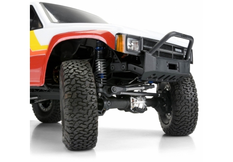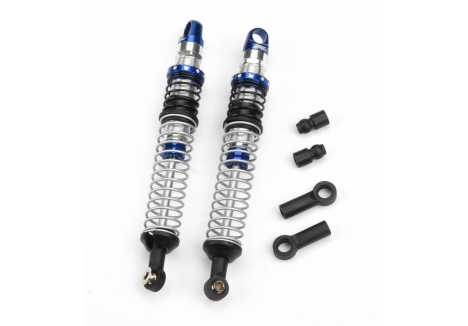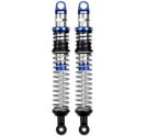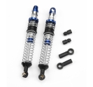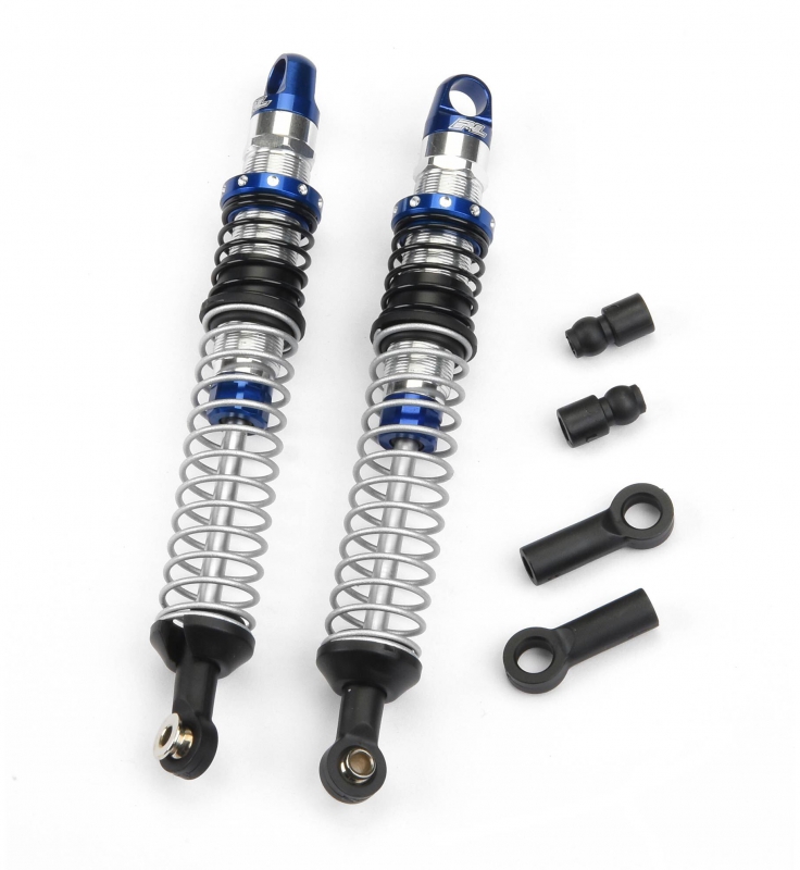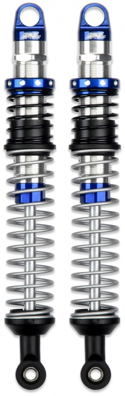 This is a pair of Pro-Spec Scaler Shocks. Pro-Line is proud to announce the next generation of RC Shock Technology with our all-new Pro-Spec Scaler Shocks! The new Shocks feature CNC machined Aluminum Shock Caps, Collars, Bodies, Bottom Caps and Hard Chrome Coated Steel Shock Shafts all made to exacting tolerances. X-Ring seals are used as the main shaft seal for smooth, low friction action and to prevent leaks. Just like Pro-Line's other Pro-Spec Shocks, the new Scalers are meant to stand out from the crowd with bright Chrome and Blue anodizing. From the top mounting hole to the bottom mounting hole these Pro-Spec Scaler Shocks measure out to be 105mm at full extended length and collapse down to about 72mm and they include extra 5mm longer Shock Ends to increase the shock length! These shocks are perfect for super scale rigs! Just like Pro-Line's extremely popular PowerStroke Shocks, the Pro-Spec Scaler Shocks come mostly pre-built (just add oil) and are designed to fit on many popular crawler vehicles. They also include Scale looking and performing Dual Rate Springs.