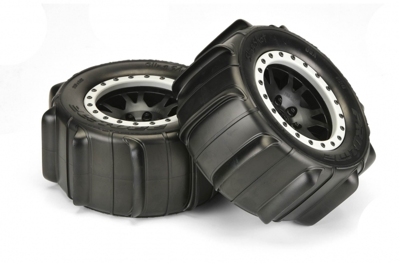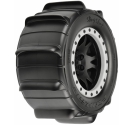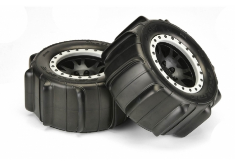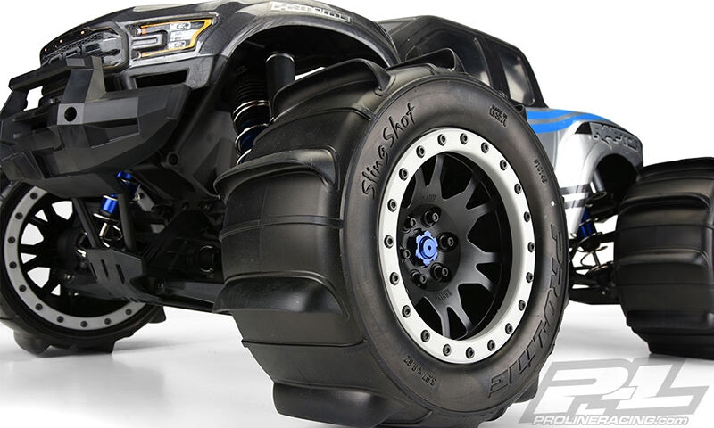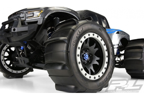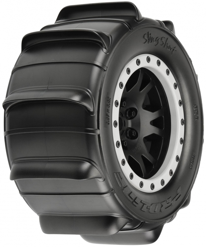 This is a pair of pre-mounted Sling Shot Paddle tires for X-MAXX®. Pro-Line is ready to unleash the Sling Shot paddle tire for X-MAXX® owners! Pro-Line Sling Shot tires are known for having an incredible scale paddle tire appearance combined with unbelievable Sand and Snow performance! These tires have been developed from the ground up for extreme X-MAXX® punishment with an all-new ultra-durable compound that prevents tire ballooning even at high speeds. The Sling Shot 4.3" tire features Pro-Line's groundbreaking proprietary Pro-Loc Technology that creates an ultra-secure bond to Pro-Line's Impulse Pro-Loc X-MAXX® wheels while still being removable when required. The reinforced Tire bead fits into a uniquely shaped channel on the wheel and the bead-loc screws actually pass through the tire rubber before being pinched by the outer bead-loc ring to create the maximum possible mounting security. This technology debuted on the Badlands MX43 Pro-Loc Tires and has proven to be extremely popular for the X-MAXX® fans.
