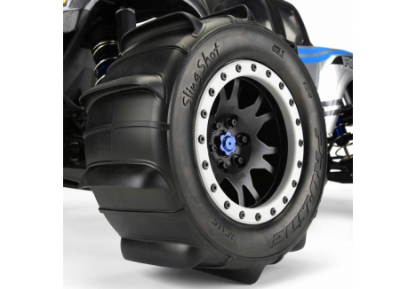The Sling Shot tires come pre-mounted to Pro-Line's Pro-Loc wheels. Pro-Line has the ultimate Wheel solution for X-MAXX® owners with the all-new Impulse Pro-Loc Wheels! The Impulse design is inspired by full-size off-road wheels with a Tough, Blacked-out look and is manufactured at Pro-Line Headquarters in the USA out of extra-thick, extremely durable material designed to take some serious abuse. The look of the Impulse Pro-Loc Wheel is finished off with the Stone Gray Bead-Loc Ring that will get your truck noticed wherever you go!