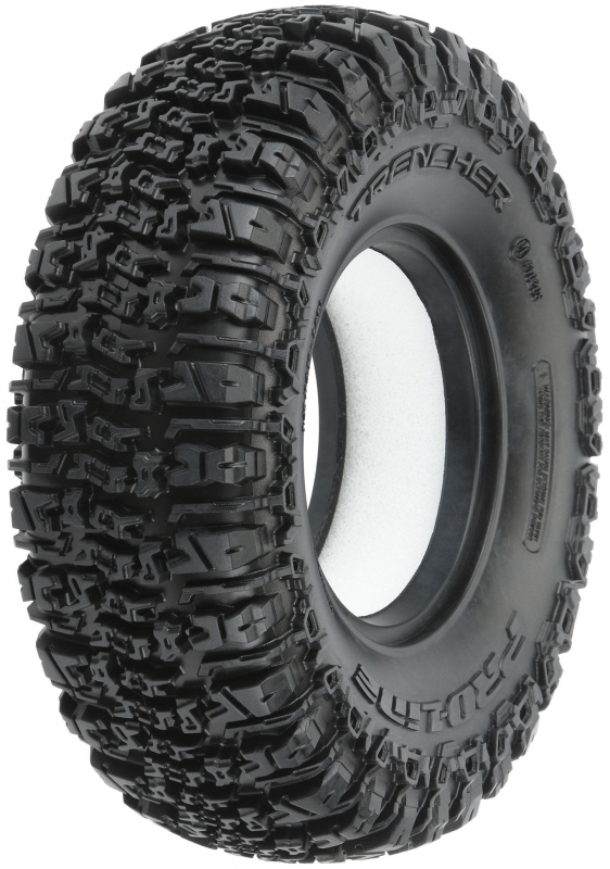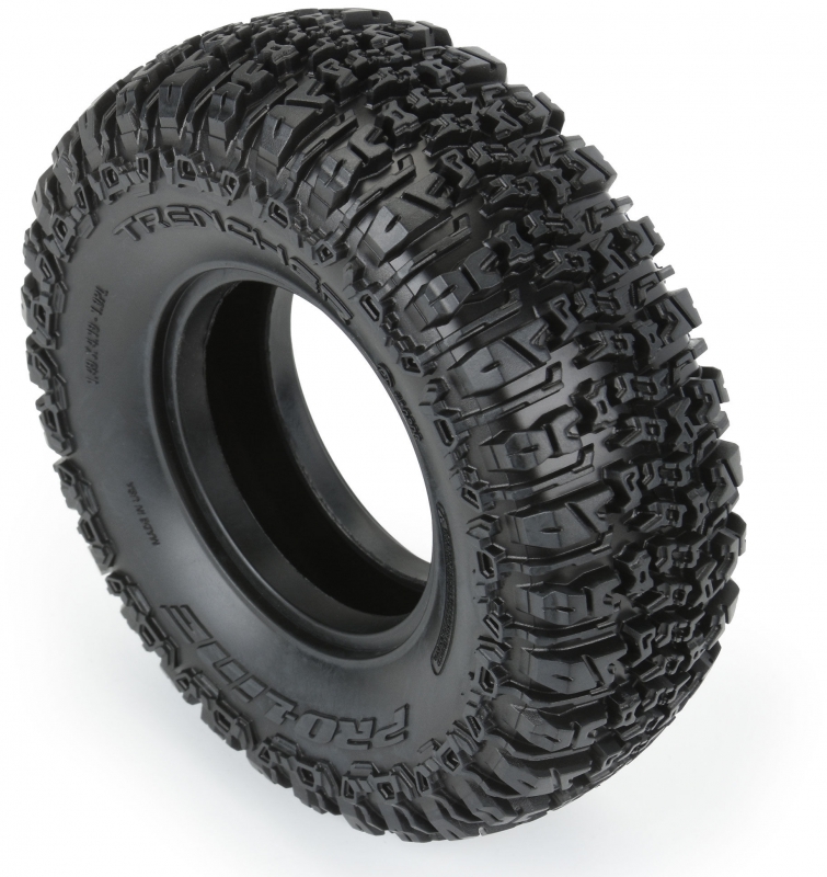 This is a pair of Class 1 Trencher 1.9" Rock Crawling Tires. The future of Class 1 Tire Performance has arrived with Pro-Line's  1.9" (4.19" OD x 1.49" Width) Trencher Tire! Inspired by Pro-Line's insanely popular all-terrain Trencher tread, this tire is ready for anything the terrain might throw at you. It features an extremely aggressive tread pattern with each tread block containing multiple sipes and multiple levels for incredible tread flex while still looking great on a Scale Rig. The highly detailed connected tread on the sidewall of the Trencher extends out for the next level of side-hilling performance that only slides out when you want it to!