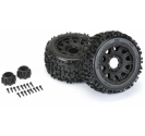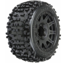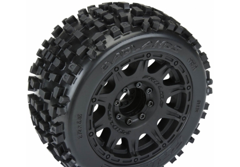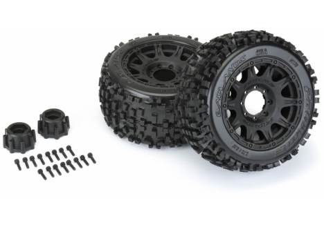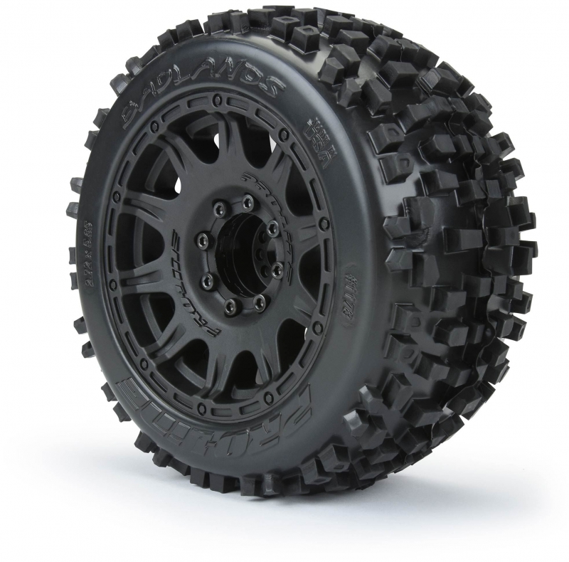 The Badlands 3.8" tires now come Pre-Mounted on the next generation 3.8" wheel design from Pro-Line, the Raid 3.8" Removable Hex Wheel! Imagine being able to replace a damaged wheel hex without needing to replace your glued tires! These new Raid 3.8" wheels make this possible by using a unique 8x32 interlocking hex design that is secured to the wheel by 8 M3 screws that are spaced 32mm across. The hexes are included and are also available separately (PRO634500). The built-in adjustability and ease of use make this a new must-have wheel for bashers everywhere! Be the first to own the latest and greatest technology from Pro-Line, get the new pre-mounted Badlands 3.8" tires now!