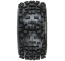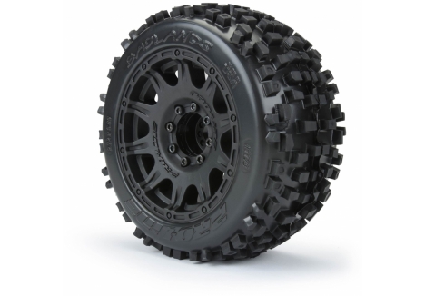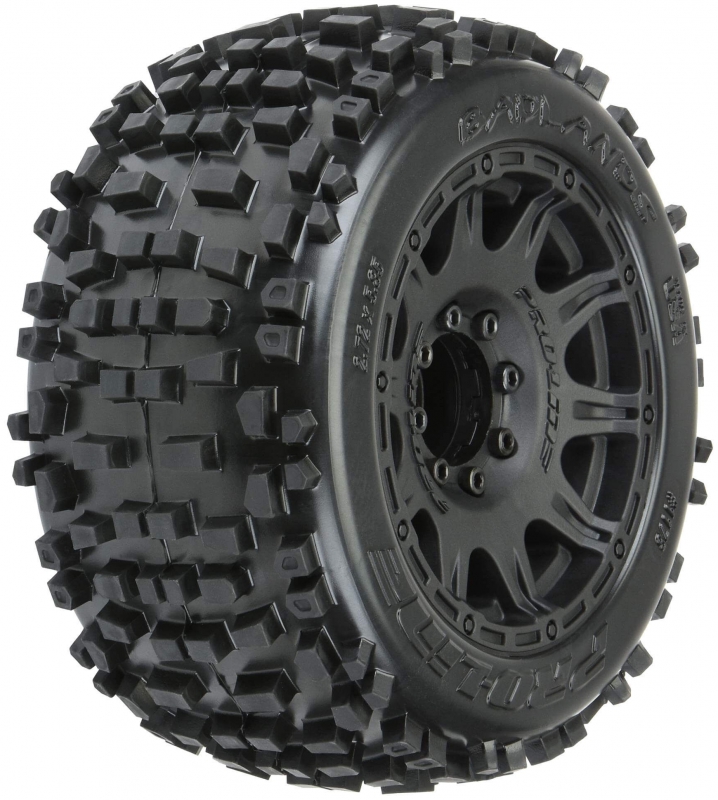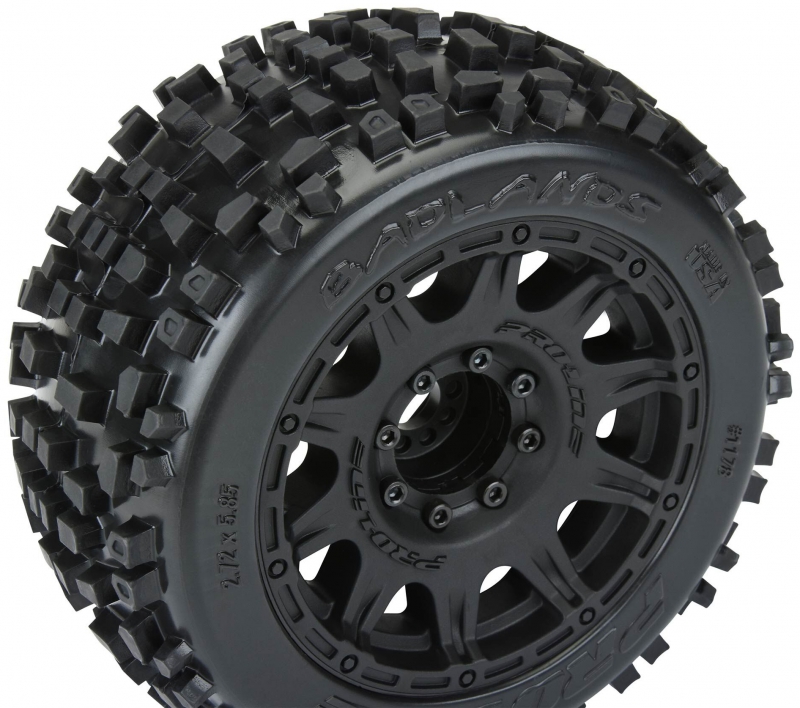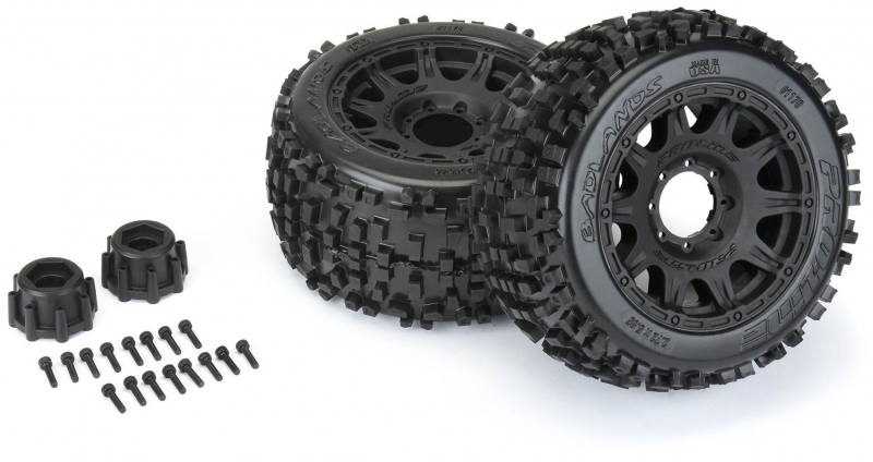 The Badlands 3.8" tires now come Pre-Mounted on the next generation 3.8" wheel design from Pro-Line, the Raid 3.8" Removable Hex Wheel! Imagine being able to replace a damaged wheel hex without needing to replace your glued tires! These new Raid 3.8" wheels make this possible by using a unique 8x32 interlocking hex design that is secured to the wheel by 8 M3 screws that are spaced 32mm across. The hexes are included and are also available separately (PRO634500). The built-in adjustability and ease of use make this a new must-have wheel for bashers everywhere! Be the first to own the latest and greatest technology from Pro-Line, get the new pre-mounted Badlands 3.8" tires now!