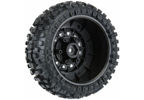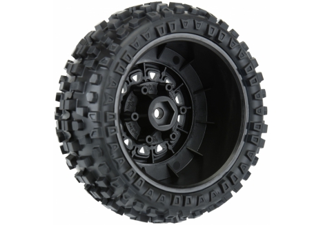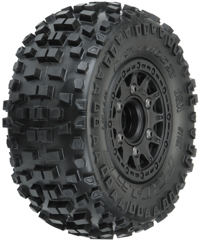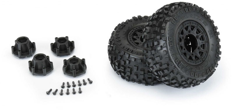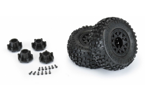 The Badlands SC tires are mounted to a pair of Raid SC Removable Hex Wheels. We take the guesswork out of your glue job by doing the mounting for you so you can spend your time having fun! Pro-Line is proud to introduce a true next-generation Short Course wheel design – the Raid 2.2"/3.0" Removable Hex Wheel for all Short Course Tires! Imagine being able to easily change the offset of your wheel to fit different applications by simply changing out the hex! Now you can with the new 6x30 Removable Hex system from Pro-Line. The wheels include a pair of 12mm Slash® 4x4 Front/Rear (Slash® 2wd Rear) hexes and a pair of 12mm Slash® 2wd Front hexes that fit the most popular trucks. Optional 14mm, 17mm and ProTrac™ offset 12mm hexes (PRO635500) are available separately to fit your exact application. If your wheel hex ever gets damaged, it can easily be replaced without needing to replace your glued tires (PRO635400 Replacement Slash® Hexes)! These new Raid SC wheels accomplish all of this and more by using Pro-Line's unique 6x30 interlocking hex design that is secured to the wheel by 6 M3 screws that are spaced 30mm across. The built-in adjustability and ease of use make this a new must-have wheel for Short Course Trucks everywhere! Get your new Raid SC pre-mounted tires today!