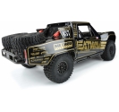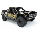 The PRO G-PRO3547-18 1967 Ford F-100 Heatwave body with Tough-Color polycarbonate for UDR is a fully licensed replica designed to deliver scale realism and rugged durability for Unlimited Desert Racer builds. Inspired by the iconic black and gold Heatwave Trophy Truck driven by Chris Isenhouer, this pre-cut body captures the aggressive styling and wide stance of its full-size counterpart. Manufactured from Pro-Line’s Tough-Color black polycarbonate, the shell is impact-resistant and unpaintable, allowing users to apply the included wrap decals and window stickers for a custom finish. With direct cage mounting and precision-cut dimensions, this upgrade offers a seamless fit and race-ready appearance for serious desert truck enthusiasts.