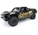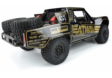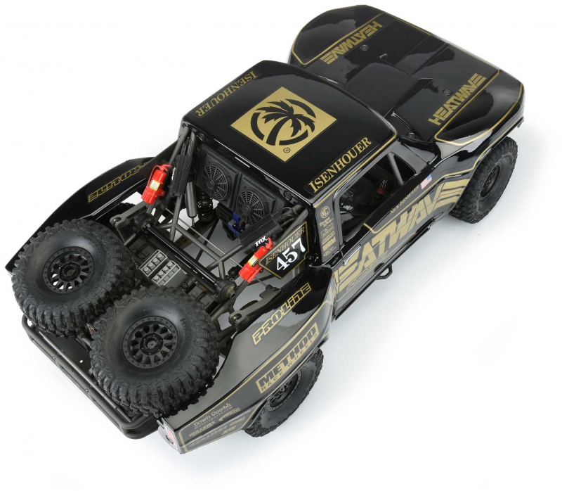 The PRO G-PRO3547-18 pre-cut black body with wrap decals and licensed Heatwave graphics brings the unmistakable look of Chris Isenhouer’s trophy truck to your RC setup. Featuring a bold black and gold wrap, flat front grille, and wide fender flares, this body captures the aggressive lines and proportions of the full-size race truck. The included decals are pre-cut for easy application and include window outlines and sponsor graphics that complete the authentic Heatwave appearance. This level of detail transforms your Unlimited Desert Racer into a scale replica that stands out on any terrain.
