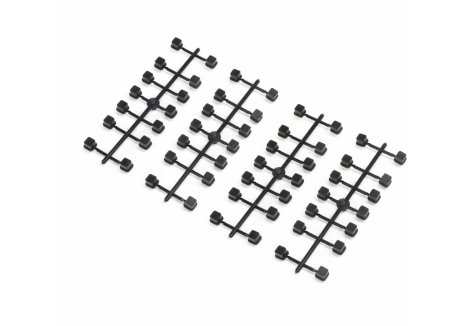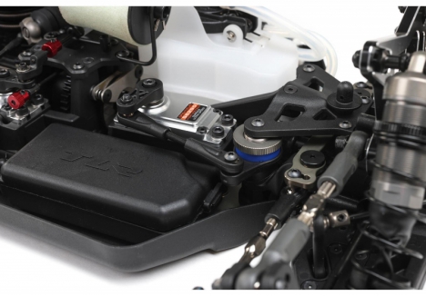 The TLR race buggy with truss suspension arms and updated shock towers is equipped with long front and rear arms featuring a truss-style base and upper stiffener plates. These components provide superior bump absorption and stability, while allowing racers to fine-tune arm flex for different track conditions. The aluminium shock towers are lightened and re-engineered with new mounting positions for camber links and shocks, enabling precise geometry adjustments. Combined with bleeder shock caps and optimized pistons, the suspension system delivers smooth travel, reduced chassis roll, and consistent grip through corners and jumps.