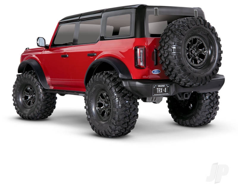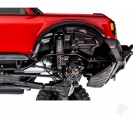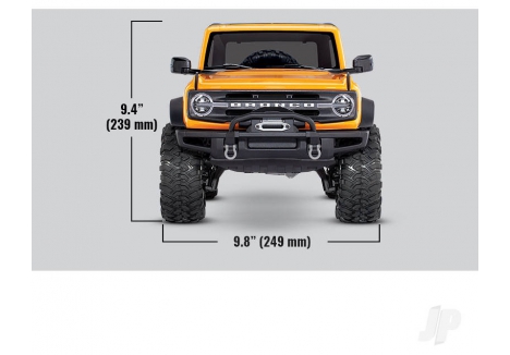 The Traxxas 1:10 scale Bronco with remote locking diffs is packed with scale details that elevate its realism. From the two-tone paint scheme and clear windows to the molded grille and Bronco logo, every exterior element is crafted to mirror the full-size SUV. Functional features like LED-ready headlights, tail lights, and a replica winch add utility and authenticity. The internal body cage supports structural rigidity while allowing body details to mount directly to the frame. The replica spare tire mount and clipless design further reinforce the scale appearance, making this crawler a standout in both performance and presentation.