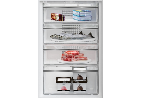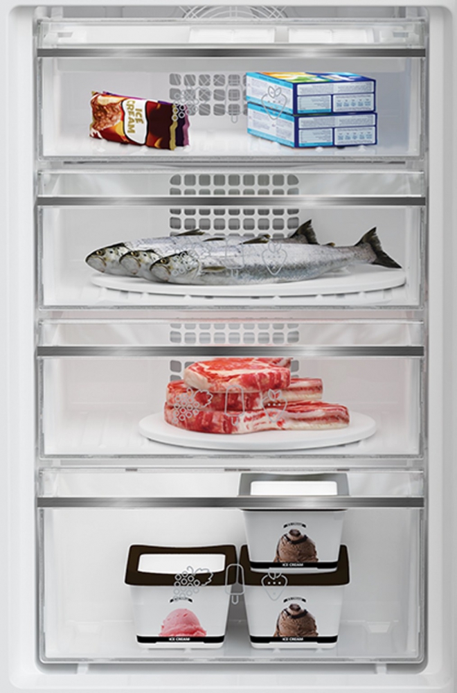 The built-in fridge freezer with LED lighting offers 163 litres of fridge space and 91 litres in the freezer. Inside the fridge, you’ll find three adjustable glass shelves, three door racks, and a large salad crisper illuminated by VitaminCare+ lighting. The freezer includes four clear drawers and a slimline ice tray, making it easy to organise frozen meals, vegetables, and batch-cooked portions.