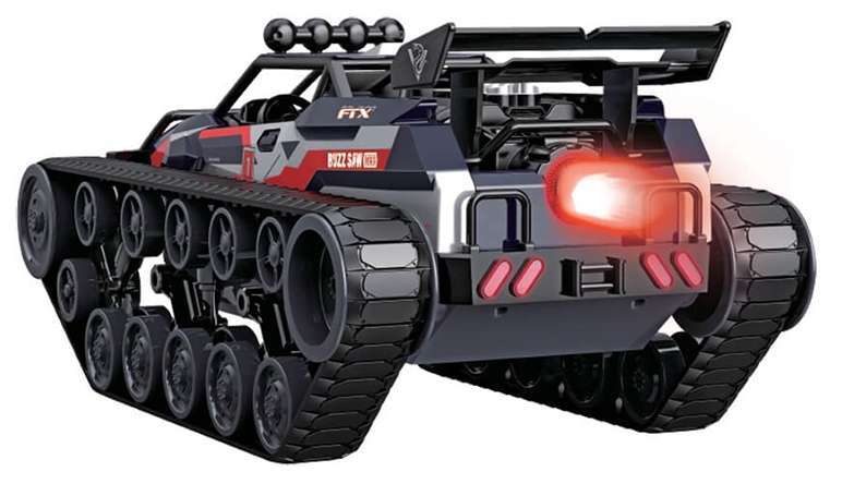 The FTX Buzzsaw 1:12 scale Xtreme edition with diecast body features metal alloy panels that reinforce the chassis and protect internal components during impact. This construction adds weight for stability and enhances the vehicle’s rugged appearance. Combined with rubber tracks and sealed electronics, the Buzzsaw is built to withstand repeated use across varied terrain without compromising performance or aesthetics.