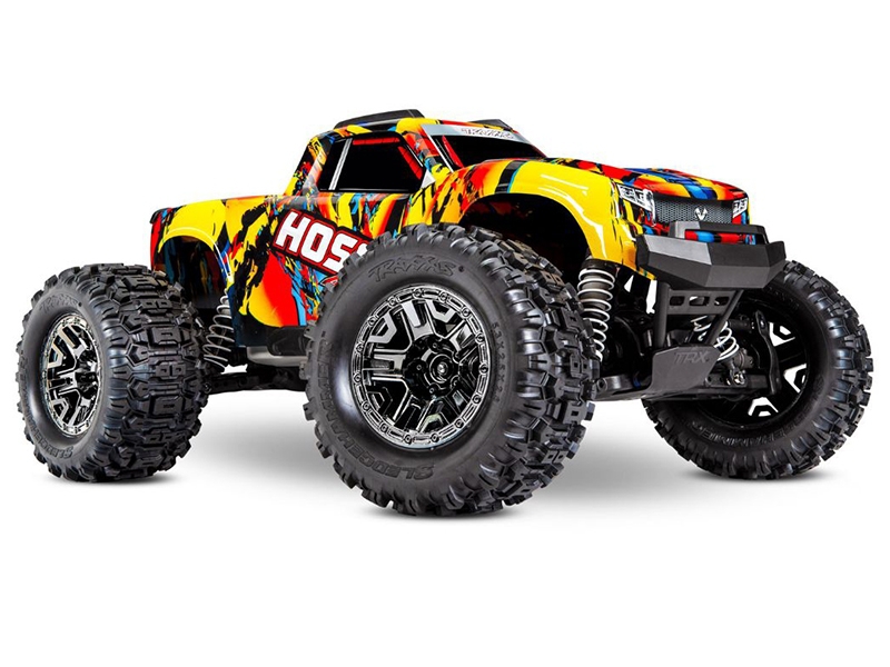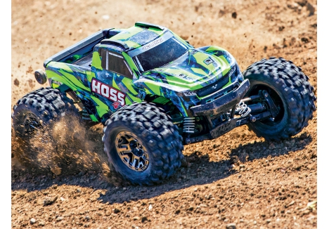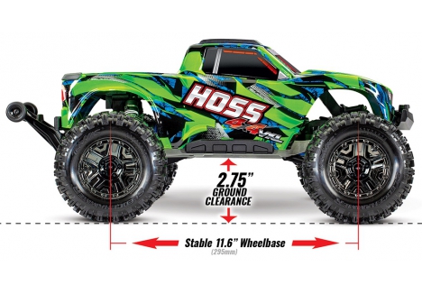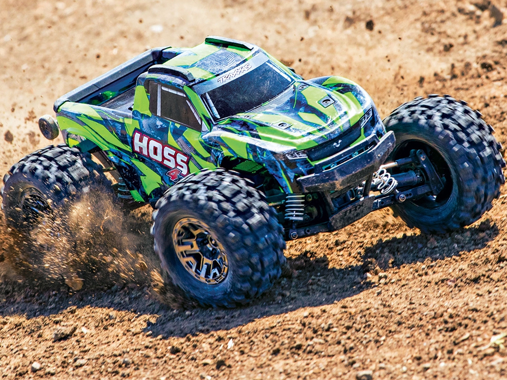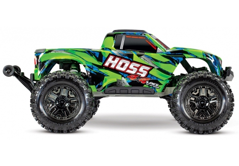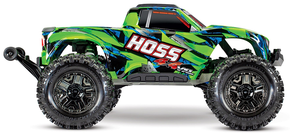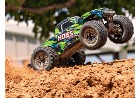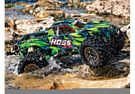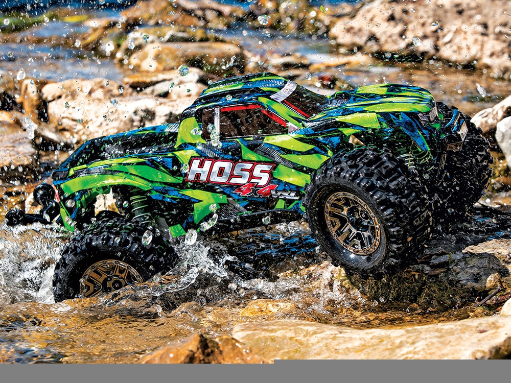 The all-new Hoss 4X4 VXL unleashes extreme monster truck fun with the speed and style only Traxxas can deliver. Grab a fistful of throttle and the Velineon 540XL motor delivers massive torque to wheelie on command and hold the front end high as long as you dare. Pitch the Hoss into a turn and slide through sideways in a cloud of dirt—all four tires dig in and drive hard no matter how rough the terrain, and the Traxxas Stability Management system keeps you in control. The rugged, reinforced pickup body covers proven performance tech, with Velineon brushless horsepower and heavy-duty shaft-driven 4WD. The Hoss delivers unmatched versatility as the aggressive Sledgehammer™ tires blast through dirt, sand, mud, and snow. Drive harder, go faster, hang tougher—legendary Traxxas durability is engineered into every component. Nothing stops the Hoss!