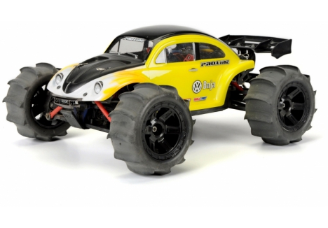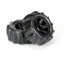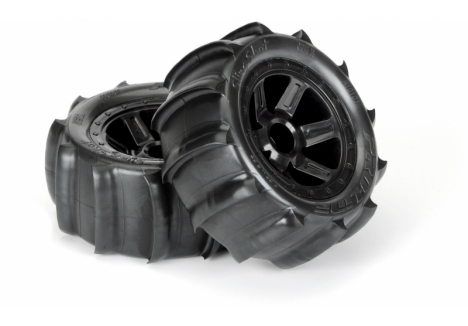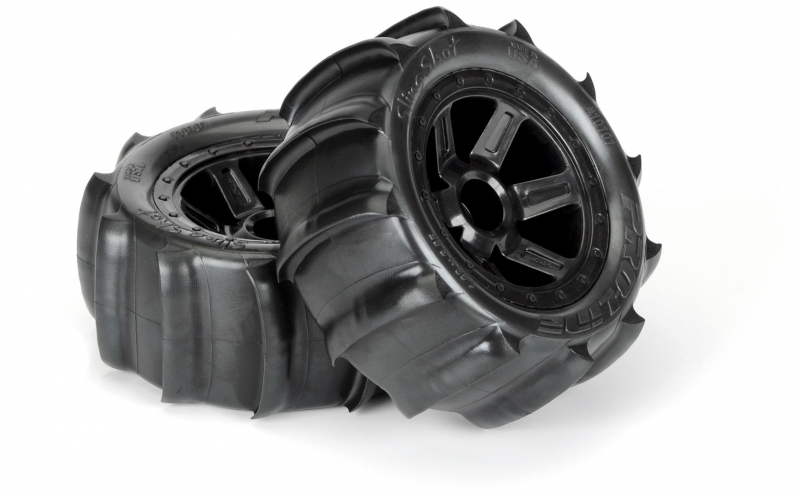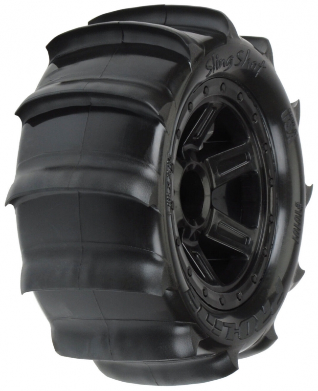 This is a pair of pre-mounted Sling Shot 2.2 in Paddle Tires. The newest form of fun is here with the release of the Sling Shot 2.2 in paddle tire mounted to Desperado wheels for mini E-REVO trucks! The Sling Shot provides hours of fun in the sand, snow or even in the occasional mud pit. The 12 paddle design ensures maximum performance due to the true scoop design coupled with low roll outer sidewalls. The Sling Shot comes complete with foam inserts and big Pro-Line fun!