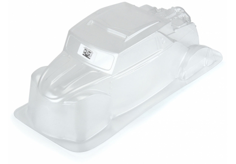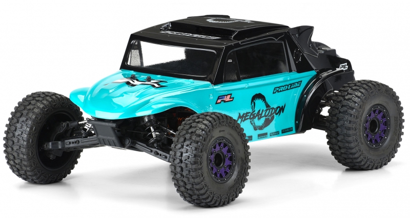 This is a Megalodon Desert Buggy Clear Body. Pro-Line is proud to release a clear version of The Megalodon: a dune-shredding, wheelie-popping, supercharged V8-powered beast of a buggy! Transform the looks of your Slash® 2wd or Slash® 4x4 with this super scale body! All the scale details of this beast of a buggy are captured including molded engine details, roof-mounted air scoop, add-on rear fenders, and shark-inspired side wings. To create the most scale Megalodon possible, we recommend using SCXL 2.2"/3.0" tires for that killer oversized look. This body comes clear so you can customize the look and paint it however you want! Thrash your local bash spot with the new Megalodon body from Pro-Line!