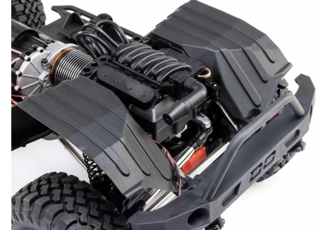 The molded V8 engine cover on the SCX6 Honcho serves dual purposes. Visually, it enhances the scale realism of the crawler, replicating the appearance of a full-size engine bay. Functionally, it acts as a mounting platform for the ESC and receiver box, protecting electronics from debris and impact. This integration of form and function reflects Axial’s commitment to realism without compromising performance. The engine cover also contributes to the overall weight distribution, helping maintain balance during climbs and descents. It’s a thoughtful design element that reinforces the SCX6 Honcho’s identity as a true scale crawler.
