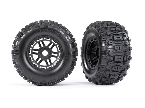 Ultra-rugged Sledgehammer tyres provides extreme traction and control for a variety of off-road terrain. The Sledgehammer's increased overall diameter provides additional ground clearance, while the open block tread design clears mud and debris for unmatched traction in loose surfaces. The tyres are TSM-rated for high-speed and come pre-mounted with foam inserts and glued to 2.8" dual-profile black Maxx wheels with a black beadlock-style ring.