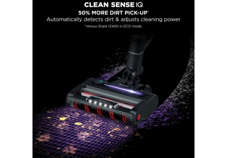 Clean Sense IQ is a smart sensor system built into the Shark IZ400UK cordless vacuum that detects hidden dirt and automatically adjusts suction power to match the cleaning challenge. As the vacuum encounters debris, the suction level increases to ensure thorough pick-up, then decreases once the area is clean. An intelligent indicator light in the floorhead illuminates to show suction activity in real time, giving users visual feedback on cleaning performance. This feature allows the Shark IZ400UK cordless stick vacuum to optimise power usage and deliver up to 50% more dirt pick-up, making it highly efficient for both spot cleaning and full-home maintenance.