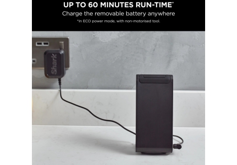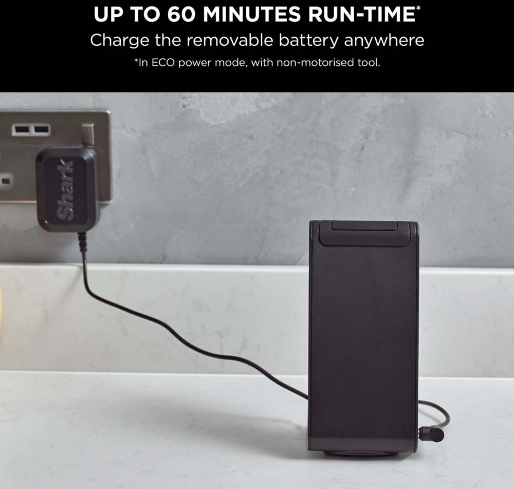 With its Flexology wand, the Shark IZ400UK cordless vacuum bends at the touch of a button to clean under low-lying furniture without requiring users to crouch or move heavy items. After cleaning, the wand folds down for compact, freestanding storage, making it ideal for homes with limited space. The vacuum also features a removable battery pack that can be charged on or off the unit, offering flexible charging options without the need for a docking station. This design supports up to 60 minutes of run-time, and users can extend cleaning time by purchasing an additional battery pack from Shark.