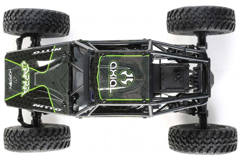 Realism is a defining trait of the Axial UTB18 Capra RTR with Nitto Trail Grappler tyres. The body panels feature licensed livery and are mounted to a tube-style cage for authentic trail buggy aesthetics. Inside, helmeted driver and passenger figures add to the scale realism, while the LED headlights, light bar, and rock lights ensure visibility during night-time crawling. The officially licensed Nitto Trail Grappler M/T tyres are mounted on Raceline Monster composite wheels, providing both grip and visual appeal. These details make the buggy a standout addition to any RC collection.