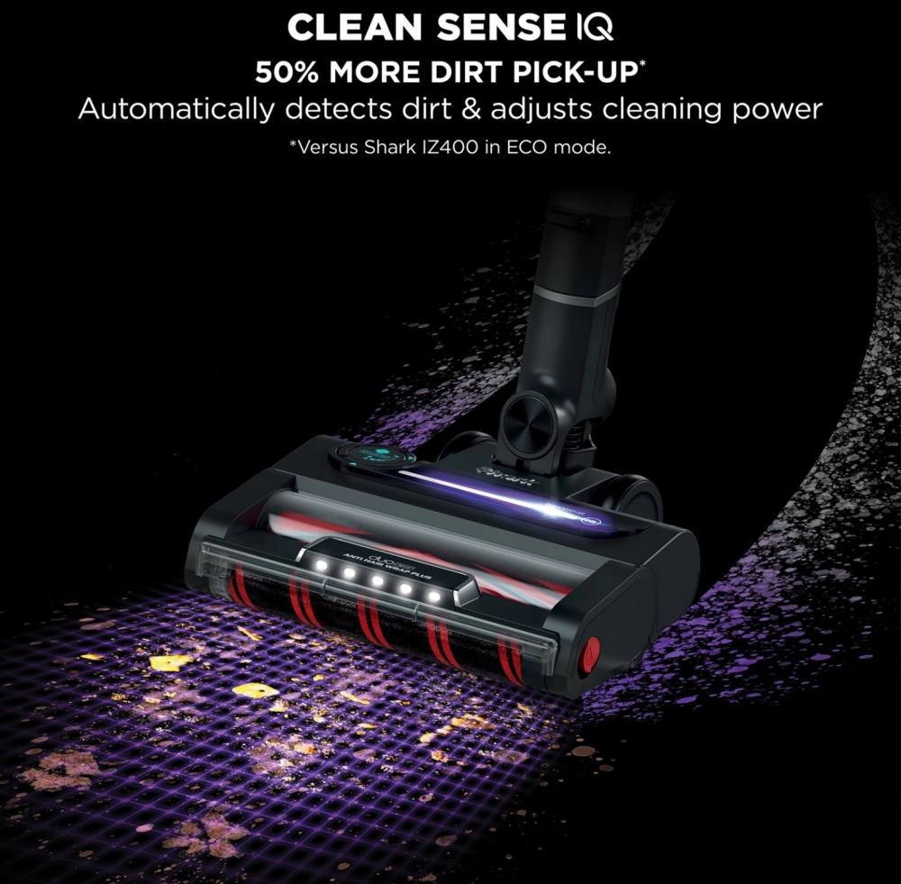 Clean Sense IQ is a smart sensor technology built into the Shark Stratos vacuum with Clean Sense IQ and 120-min runtime IZ420UKT. It automatically detects hidden dirt and adjusts suction power in real time to deliver up to 50% more dirt pick-up. An intelligent indicator in the DuoClean floorhead illuminates to show the suction level, increasing when more debris is detected and decreasing once the area is clean. This ensures optimal cleaning performance across all surfaces, without the need to manually change settings.