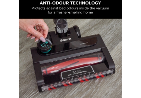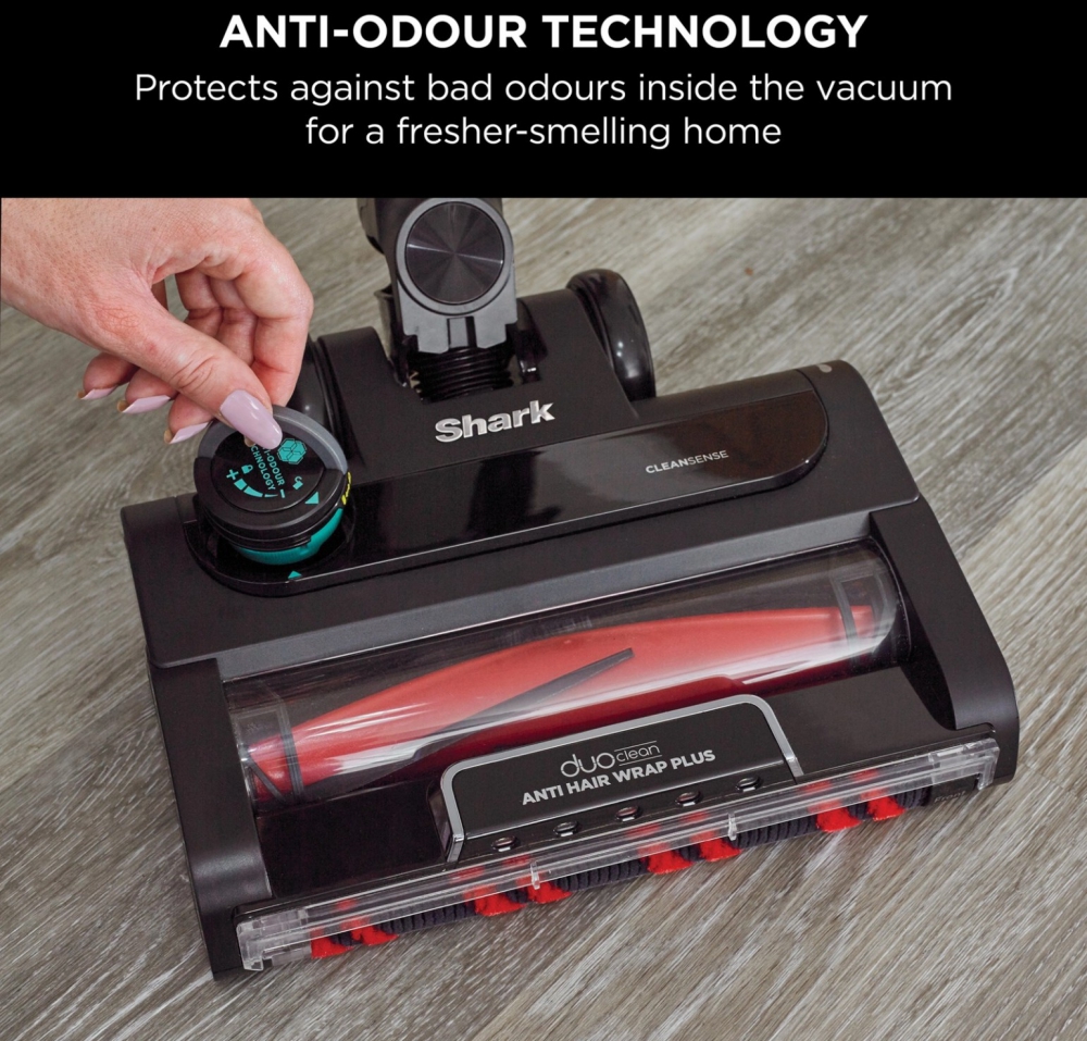 Bad odours caused by pet hair, dust and dander are neutralised by Shark’s Anti-Odour Technology. The Shark cordless vacuum with anti-odour cartridge and Flexology wand includes a unique cartridge system that drives neutralising technology through the air path and into the dust cup. Users can adjust the intensity using the dial on the floorhead, selecting the level of fragrance that suits their home. This feature helps maintain a fresher-smelling environment, especially in homes with pets, and the cartridge lasts approximately six months before replacement is needed.