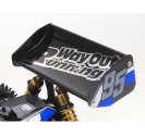 The Tamiya polycarbonate RC body kit includes a 0.7mm thick body shell, 1.0mm wing, and underguard—all designed for lightweight strength and aerodynamic performance. These components resist impact and flex, making them ideal for off-road use. The body’s detailed contours and black-themed decals give the buggy a professional finish that stands out on the track.