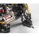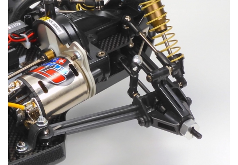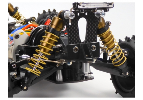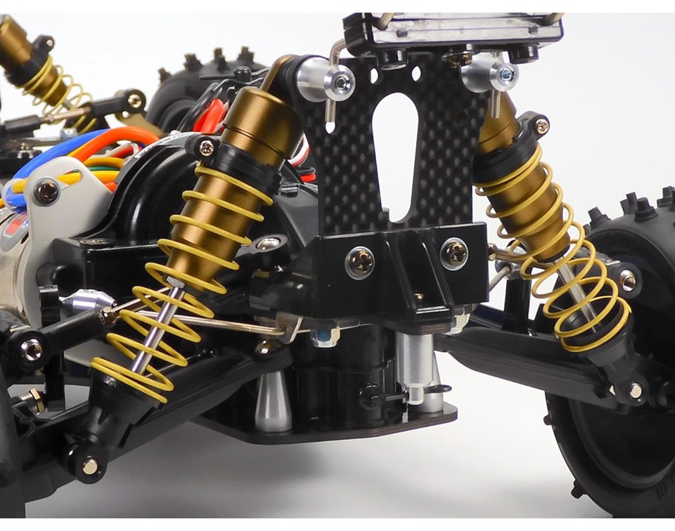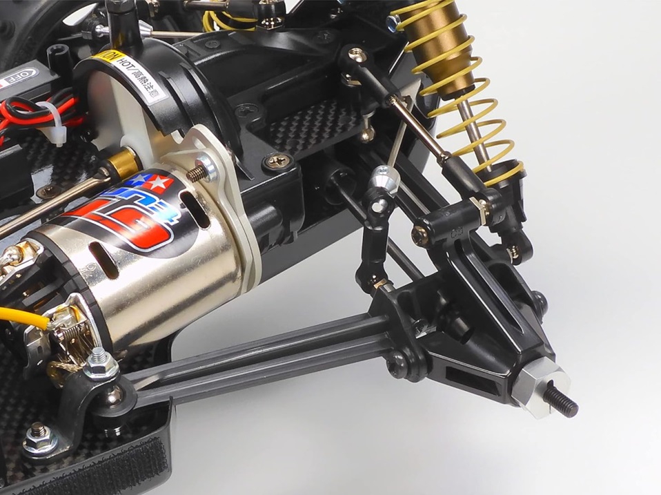 The Tamiya titanium anodised RC buggy features dark titanium finishes on the front and rear damper cylinders and front uprights. These components not only elevate the visual appeal but also improve wear resistance and structural integrity. The anodised surfaces protect against corrosion and add a race-inspired look to the suspension system.