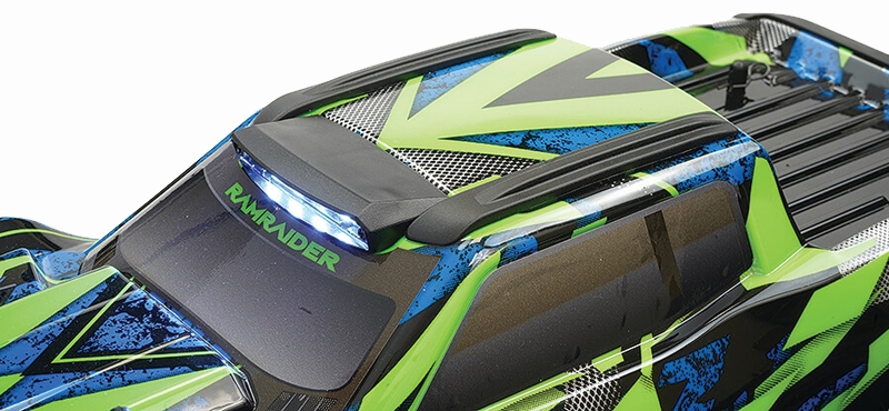 Powered by a Hobbywing 50A brushless speed control and 2500kv motor, coupled with the included Voltz 3S 3500mAh Lipo battery the RamRaider can reach impressive top speeds for its size, while still being very drivable on most surfaces. The rear mounted wheelie bar works to provide a sta-ble footing for those heavy accelerations when you light up the rear tyres.