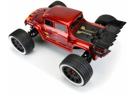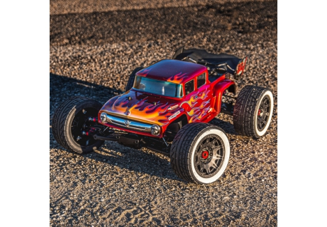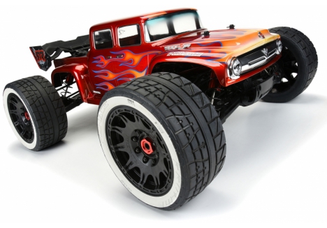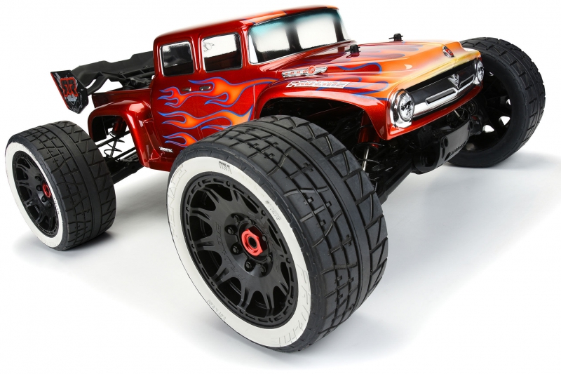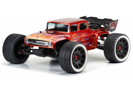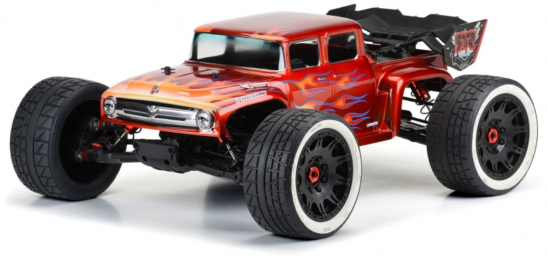This is a 1956 Ford® F-100 Clear Body for Kraton™ 8S. Pro-Line is excited to bring some retro classic styling to the Kraton™ 8S for the first time! This old-school Ford® F-100 body completely transforms the look of your truck, featuring a custom hot-rod style extended cab, aggressive fender flares, and the iconic old-school chrome grill of the '56 blue oval fan favorite. Pair the F-100 with the Menace 5.7" Belted Tires (PRO1020510) for a true street machine combo!