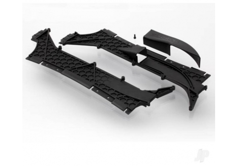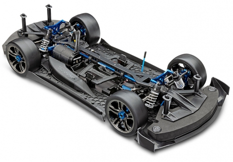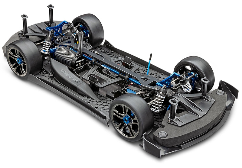 The Traxxas supercar with aluminium chassis and wireless telemetry system features a 3mm thick dual-plane 6061-T6 aluminium chassis that provides a rigid, lightweight foundation for high-speed operation. This structure resists flex under load, maintaining suspension geometry and drivetrain alignment during aggressive driving. The extruded aluminium driveshaft runs the full length of the chassis, ensuring efficient torque transfer and drivetrain stability. Combined with a low ground clearance of 1.5 cm and a wide track width of 32.9 cm, the chassis design supports precise handling and aerodynamic balance at speeds exceeding 100mph.