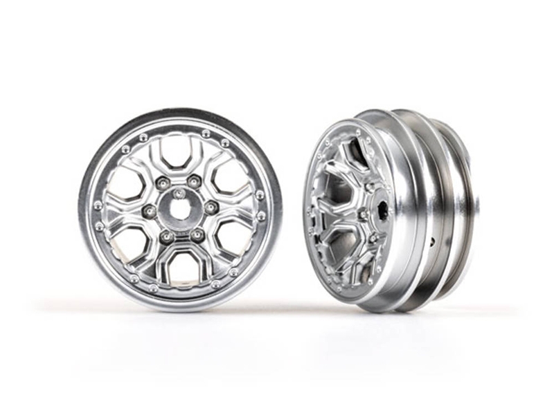 Designed for TRX-4M models, these 1.0" Satin Chrome multi-spoke wheels hold the tyre securely for rugged crawling action. Sold as a pair. (Fits 7 mm wheel hex)