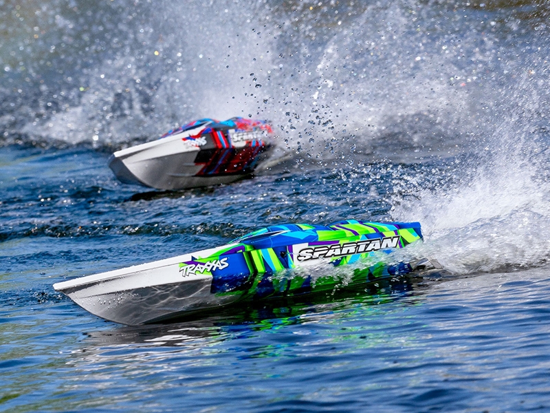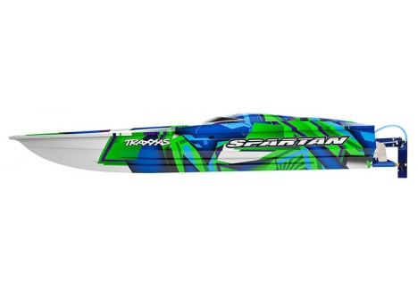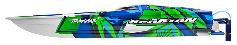 Spartan is the kind of boat you expect from Traxxas. Its 50+mph fury makes even the most insatiable, power-hungry enthusiasts jump up and take notice. Spartan means business with its super-rigid, 36-inch deep-V hull, smooth, cable-drive efficiency, innovative water cooling system, and precision aluminum and stainless steel drive controls. The clean, modern hull design is built up in layers for maximum rigidity and its bold new paint makes a statement on the water. The integrated battery trays secure a wide variety of battery packs from 8.4V NiMH batteries all the way up to 8400mAh 3s LiPo packs. A high-output TQi 2.4GHz radio with the innovative Traxxas Stability Management (TSM) system keeps Spartan under complete control as it slices through the water. Spartan delivers the power, speed, convenience, and fun for which Traxxas' award-winning cars and trucks are known. Prepare yourself for the ultimate RC boating power trip, only from Traxxas.