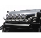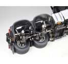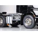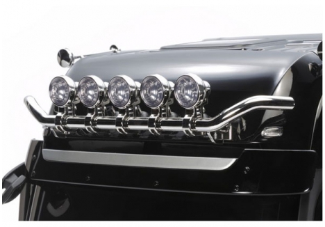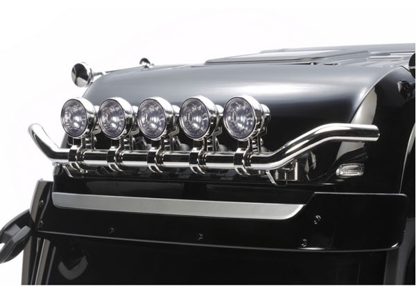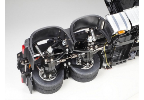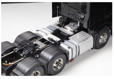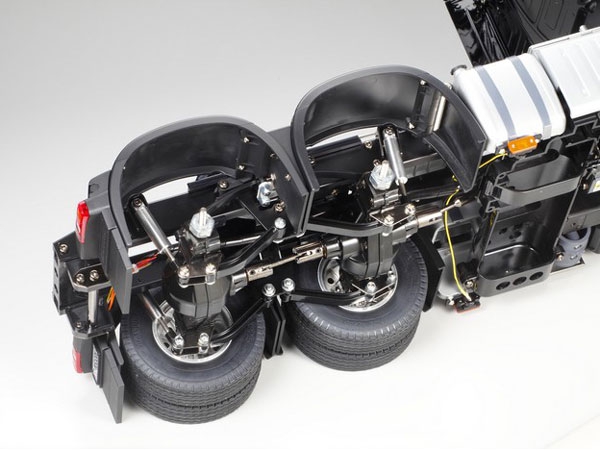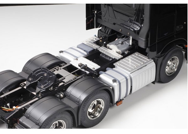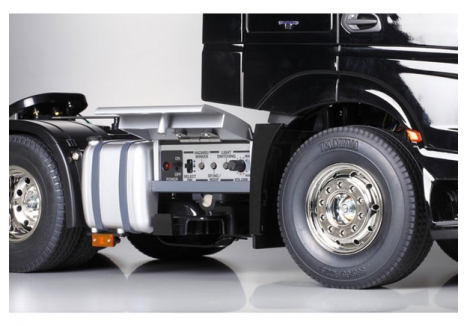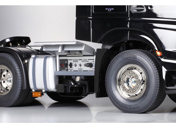 The Tamiya rendition faithfully captures the truck's modern form with the use of ABS plastic body parts and a number of metal chassis components. One look at the detailed interior and auxiliary equipment, such as air tanks, will confirm that the body features replica-quality realism, which is further enhanced with metal transfers depicting emblems and numerous metal-plated parts. The chassis is built for durability as it uses aluminum side channels with resin cross members. Drivability is accomplished by power from the front-mounted motor and is transmitted via a propeller shaft to the rear axle; built-in differential gears guarantee smooth cornering. Gear changes can be made via a separately-sold 4-channel transmitter.