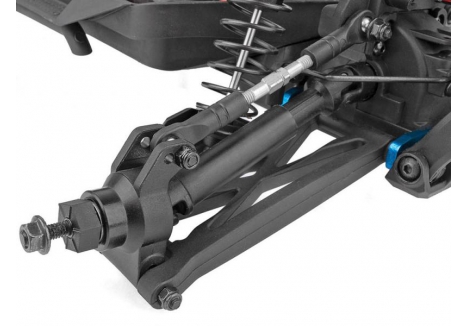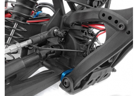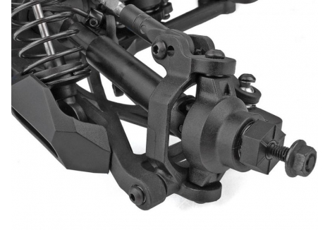 The suspension system on the Team Associated AS20518C RIVAL MT10 V2 RTR is designed for maximum terrain adaptability. Each wheel is supported by a long-travel independent suspension setup, managed by four threaded, oil-filled coil-over shocks. These shocks are adjustable, allowing users to fine-tune ride height and damping characteristics based on surface conditions. Whether you're crawling over rocks or launching off dirt mounds, the suspension absorbs impact and maintains wheel contact, improving traction and control. This setup ensures that the truck remains stable and responsive, even when navigating uneven or unpredictable terrain.