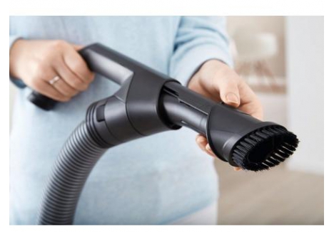 Its 890 W PowerLine motor generates a strong, consistent suction flow of up to 100 km/h, making it an ideal bagless vacuum cleaner for pet hair and allergies. The TurboBrush effectively lifts embedded hair and lint from carpets and upholstery, while the EcoTeQ floorhead ensures energy-efficient vacuuming with minimal noise output.