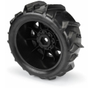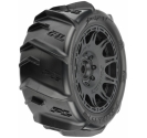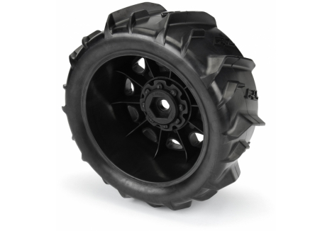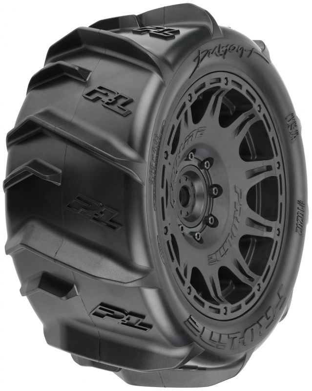 This is a pair of Dumont Paddle Sand/Snow Tires Mounted on Raid 5.7" Black Wheels. Are you ready for the most extreme Paddle tires Pro-Line has ever made for Monster Truck? Introducing the Dumont 5.7" tires that have been designed from the ground up for your X-MAXX® and KRATON™ 8S to sling sand and snow further than ever before and look good doing it!