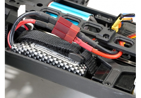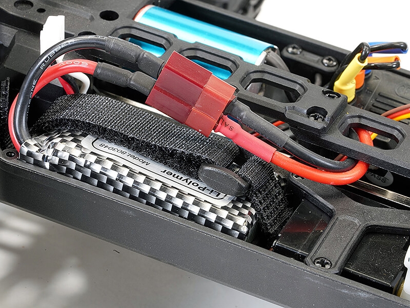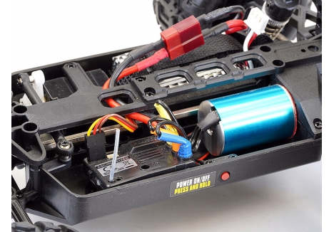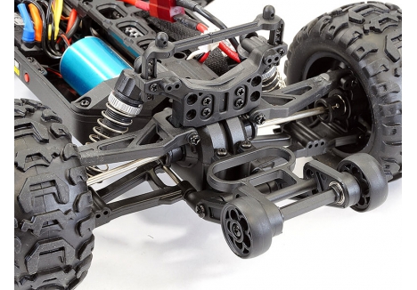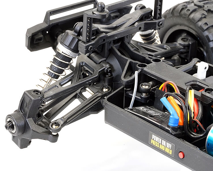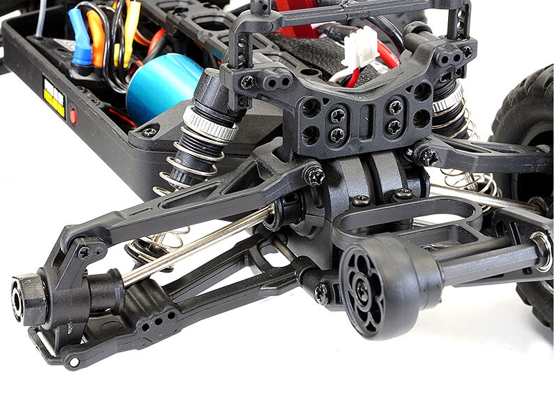 With a 3800kv brushless motor hooked up to a 7.4v 1000mAh 2S lipo battery the Tracer brushless really puts to use its rear mounted wheelie bar. Metal rear dogbones are included for extra durability along with new rear upper suspension links for added reliability under power.