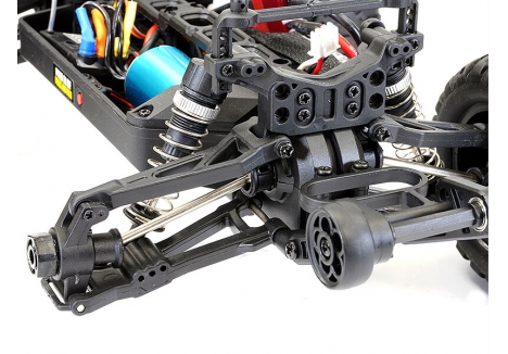 A new 100m range radio is provided to help control those longer speed runs and as with the brushed version, the Tracer brushless edition features coil sprung shock absorbers with multiple mounting points, double wishbone suspension and front universal driveshafts for smooth suspension movement while steering through the rough stuff. Shaft driven 4WD and with geared differentials front and rear provide traction in all conditions.