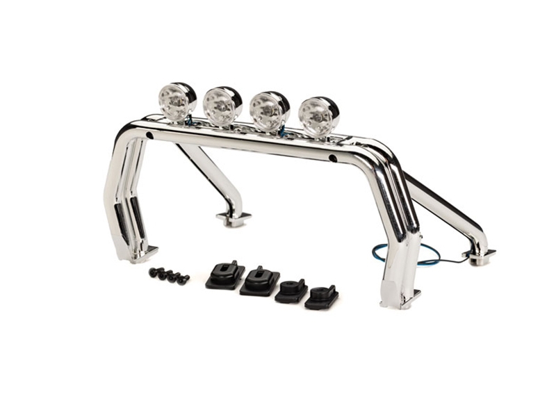 Add more scale detail to your TRX-4 Chevrolet K10 or Ford F-150 pickup body with this chrome roll bar with working LED lights. Includes left and right mounts and 2.6 mm screws (4). (requires 9212-series K10 or 9230-series F-150 body with LED light kit installed)
