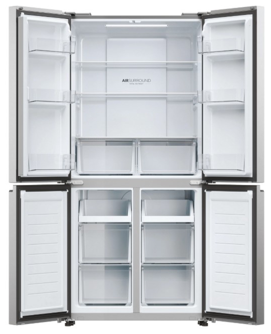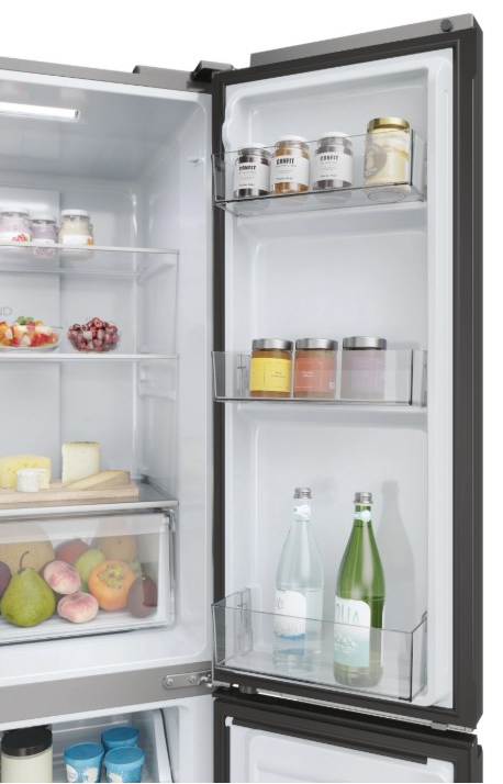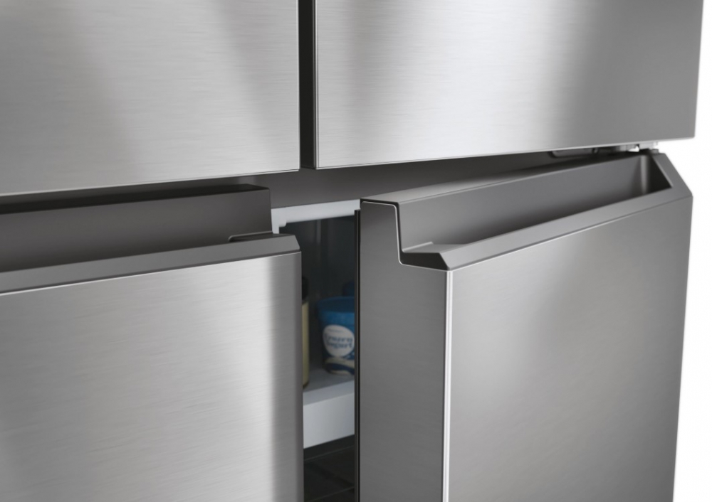 - Four-door layout with silver-trimmed glass shelves and integrated handles for a premium look