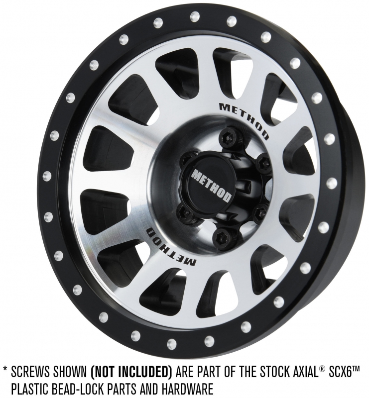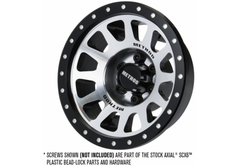 These machined 12-spoke aluminum wheel faces bolt up to your stock Axial® SCX6™ bead-lock plastic wheels to create the ultimate scale rock-crawling wheel. All the details from the 1:1 Method wheel are recreated in 1/6 scale, including the 2-tone silver & black anodized finish, engraved Method logos, and black center wheel-nut cap. The Method 305 NV wheel faces feature a 17mm Hex Pocket with +2mm offset, to give your SCX6™ tires more clearance around the steering links. Give your SCX6™ wheels the ultimate facelift with the Method 305 NV Bronze 2.9" Aluminum Wheel Faces!