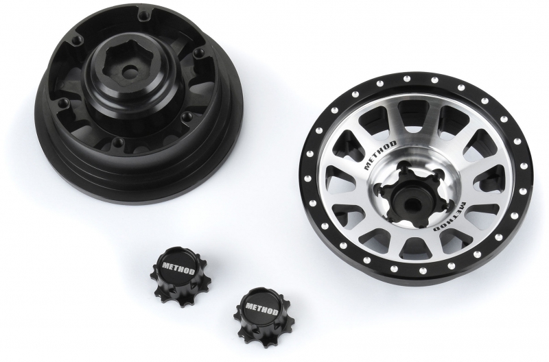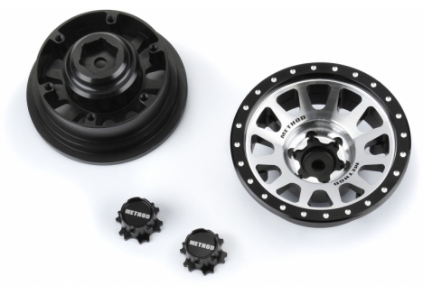 The Pro-Line G-PRO2814-00 Method 305 NV 2.9 inch aluminum wheel faces deliver a premium upgrade for Axial SCX6™ rock crawlers, combining scale realism with functional performance. Designed as a direct bolt-on enhancement for SCX6™ stock bead-lock wheels, these CNC-machined aluminum faces replicate the iconic Method 305 NV styling in precise 1/6 scale. Featuring a two-tone silver and black anodized finish, engraved Method branding, and black center nut caps, the wheel faces elevate both the aesthetic and mechanical profile of your SCX6™ build.