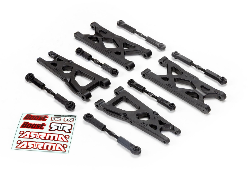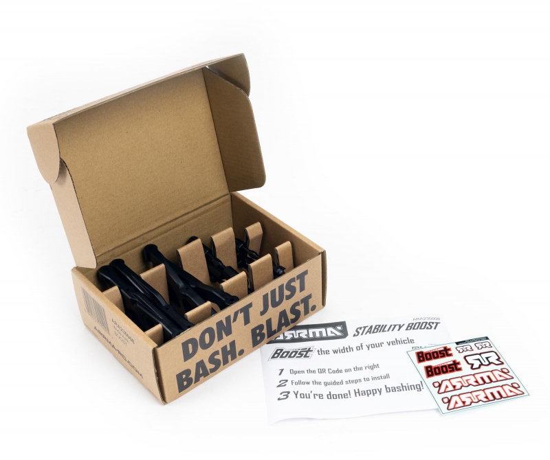 Whether you're looking for ways to upgrade your beginner-level 4X2 MEGA BOOST or want to take your 4X4 MEGA or 3S RC basher to the next level, you can improve the stability of any ARRMA GRANITE or VORTEKS — especially in curves — by widening its track with this Wide Arm BOOST Box option package. In addition to wishbones and turnbuckles, the ARRMA Wide Arm BOOST Box includes a QR code that links to a step-by-step assembly video for easy installation. You also get a colorful ARRMA BOOST decal sheet. Go from bashing to blasting with amplified ARRMA performance by adding the ARRMA Wide Arm BOOST Box option package to your ARRMA GRANITE or VORTEKS vehicle, as you continue on your journey toward becoming the best RC driver you can be.